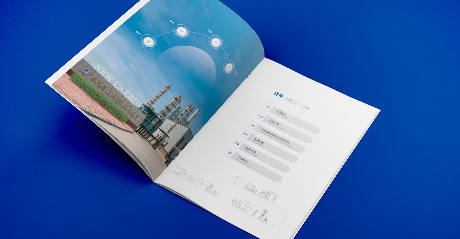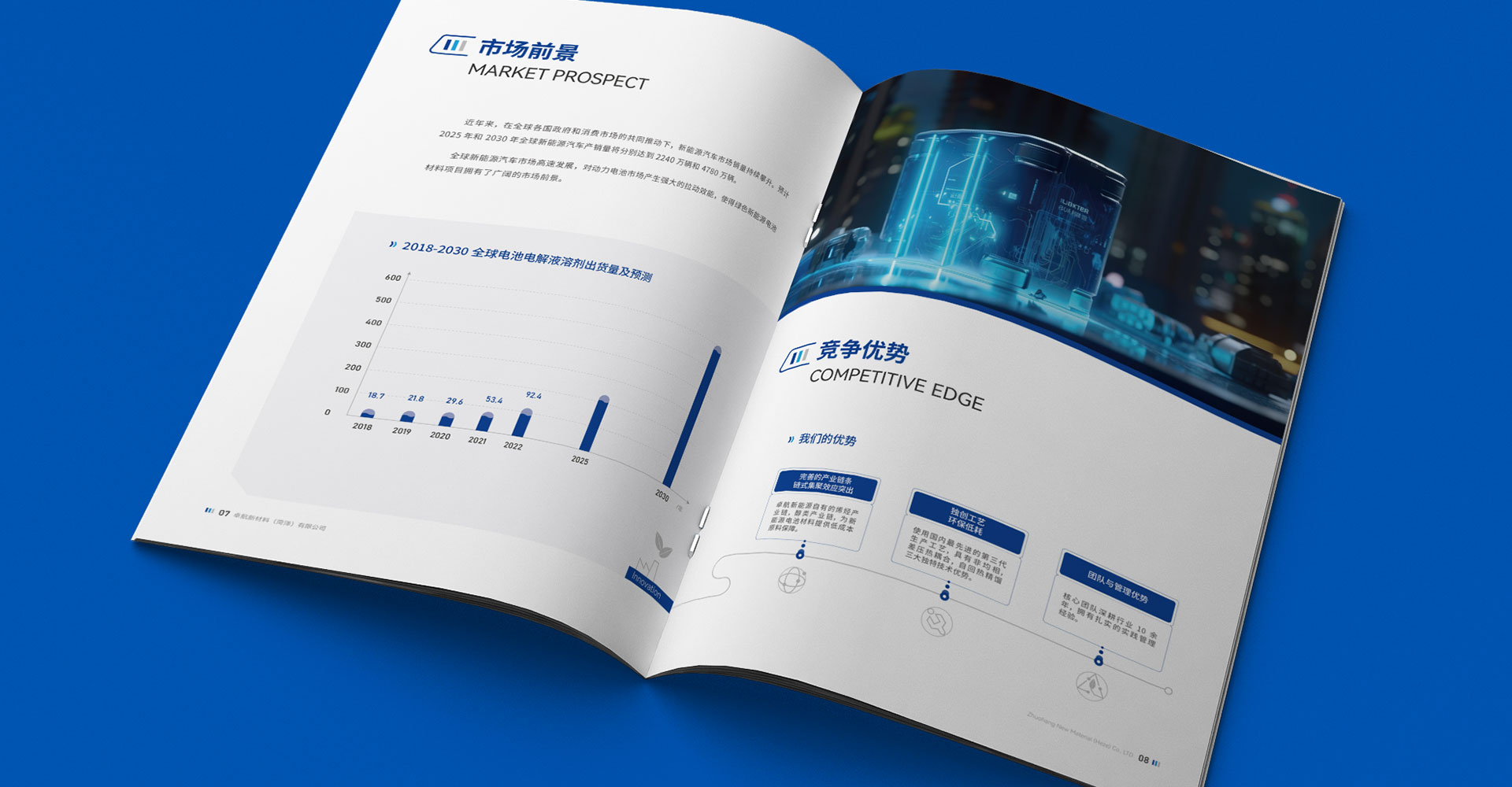 我們將宣傳冊(cè)分為公司簡介、公司環(huán)境、綠色新能源電池材料項(xiàng)目、市場(chǎng)前景、競(jìng)爭(zhēng)優(yōu)勢(shì)以及產(chǎn)品介紹等六個(gè)板塊。公司簡介及環(huán)境讓受眾對(duì)企業(yè)有一個(gè)基本的認(rèn)識(shí),重點(diǎn)介紹綠色新能源電池材料項(xiàng)目,并對(duì)市場(chǎng)前景、競(jìng)爭(zhēng)優(yōu)勢(shì)進(jìn)行分析,幫助受眾梳理企業(yè)強(qiáng)勢(shì)之處,以體現(xiàn)卓航新材料的專業(yè)性和領(lǐng)先性,展示產(chǎn)品時(shí)圖文結(jié)合,配合圖表,信息分明。