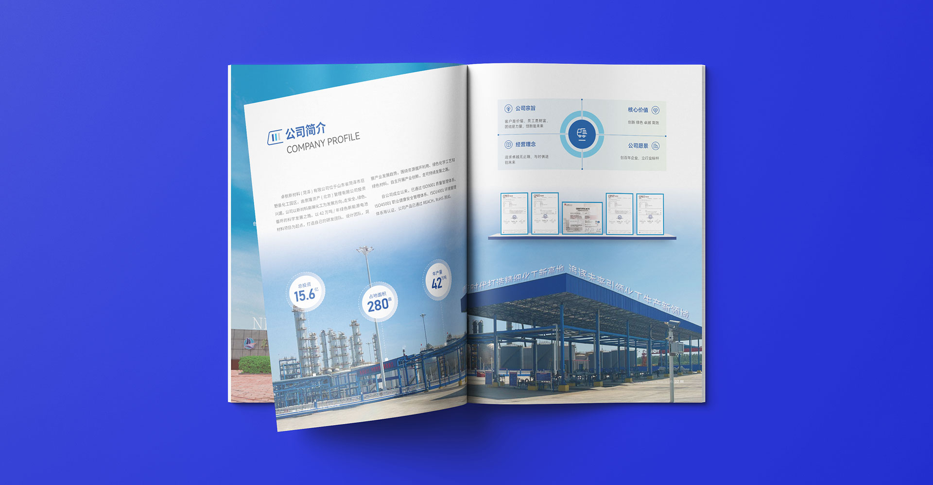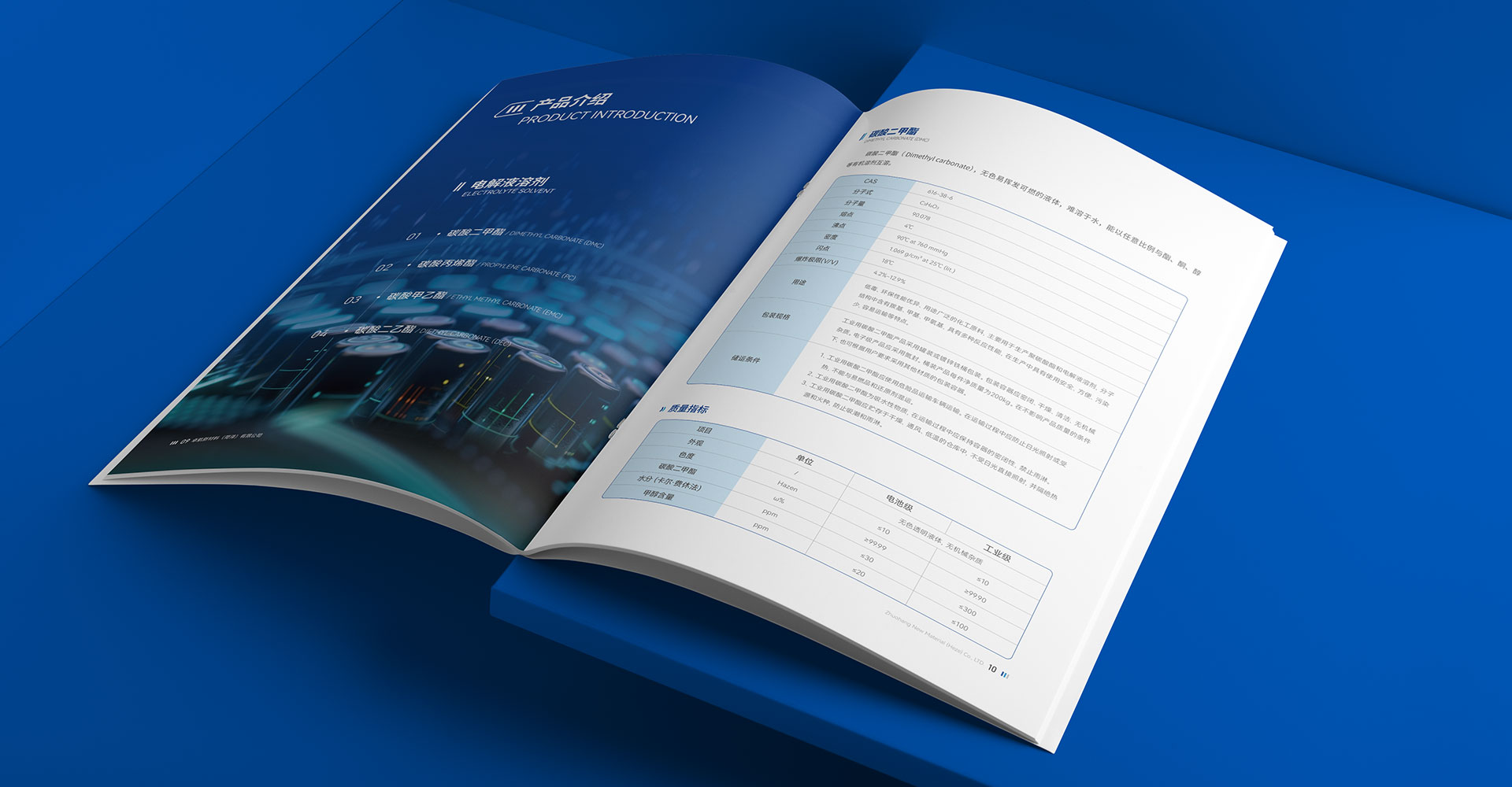 封面元素選用科技型簡單線條,深藍(lán)色貫穿全冊(cè)、搭配適量的白色或其他淺色調(diào),使整本畫冊(cè)既沉穩(wěn)又明快,符合卓航新材料的品牌調(diào)性。