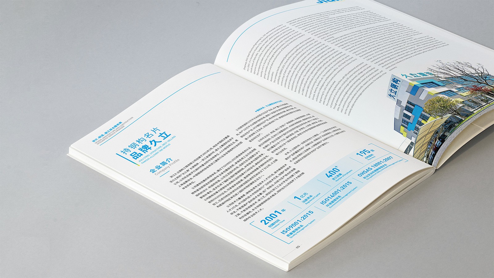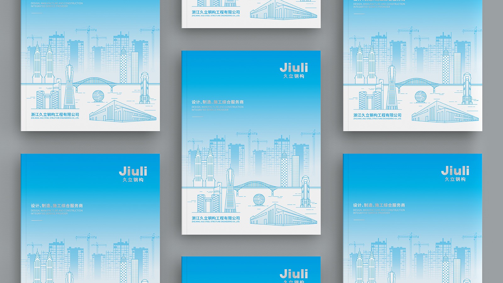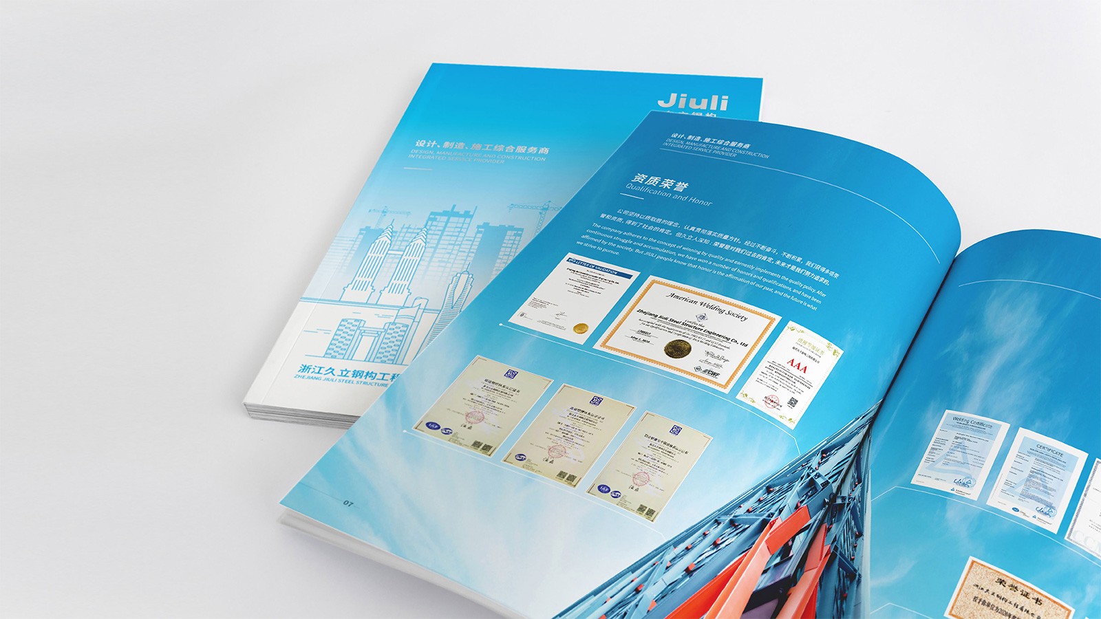 浙江久立鋼構工程有限公司創(chuàng)建于2001年2月,地處中國經(jīng)濟最具活力之稱的“長三角”太湖南岸——浙江省湖州市,是久立集團的全資子公司,公司建有完善的質保體系,通過了ISO9001:2015質保體系的認證。擁有建設部頒發(fā)的鋼結構專業(yè)承包壹級資質。承接各類工業(yè)與民用鋼結構的設計、制造和安裝。公司立足國內(nèi)市場,目前已在全國建立多個營銷辦事處,逐步形成了輻射全國的營銷網(wǎng)絡,并積極參與國際競爭。“以成熟的技術和可靠的產(chǎn)品質量服務用戶,貢獻社會,發(fā)展自己”是久立的文化,可見公司對宣傳冊設計有著較高的要求,因此委托石特設計一本體現(xiàn)公司理念的宣傳冊。