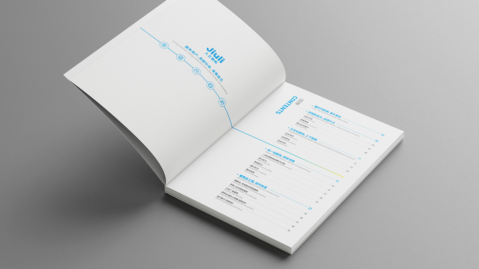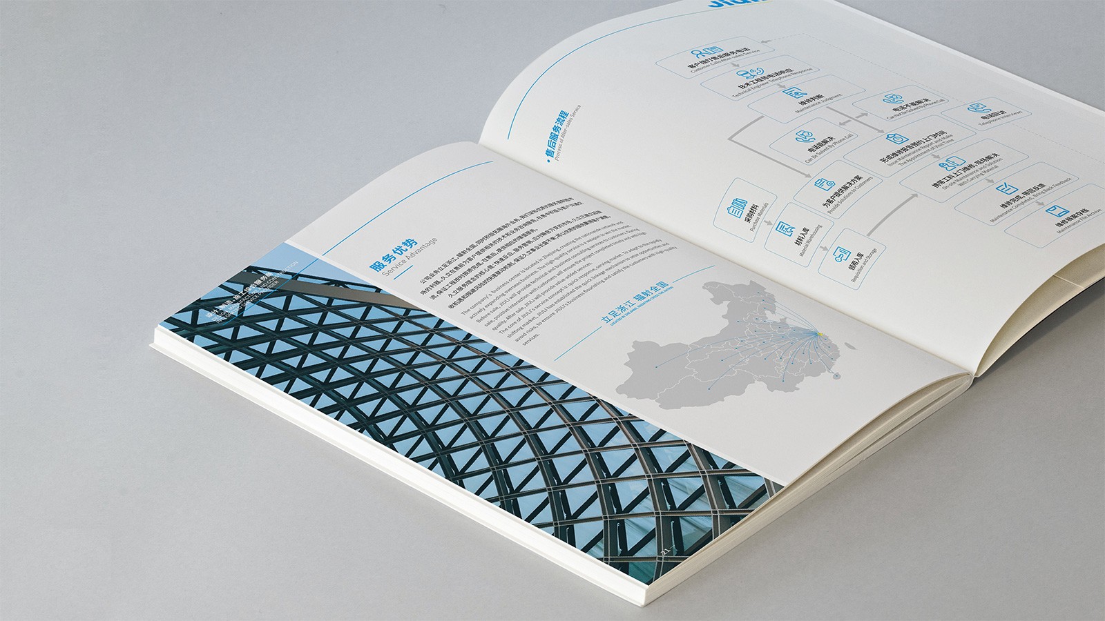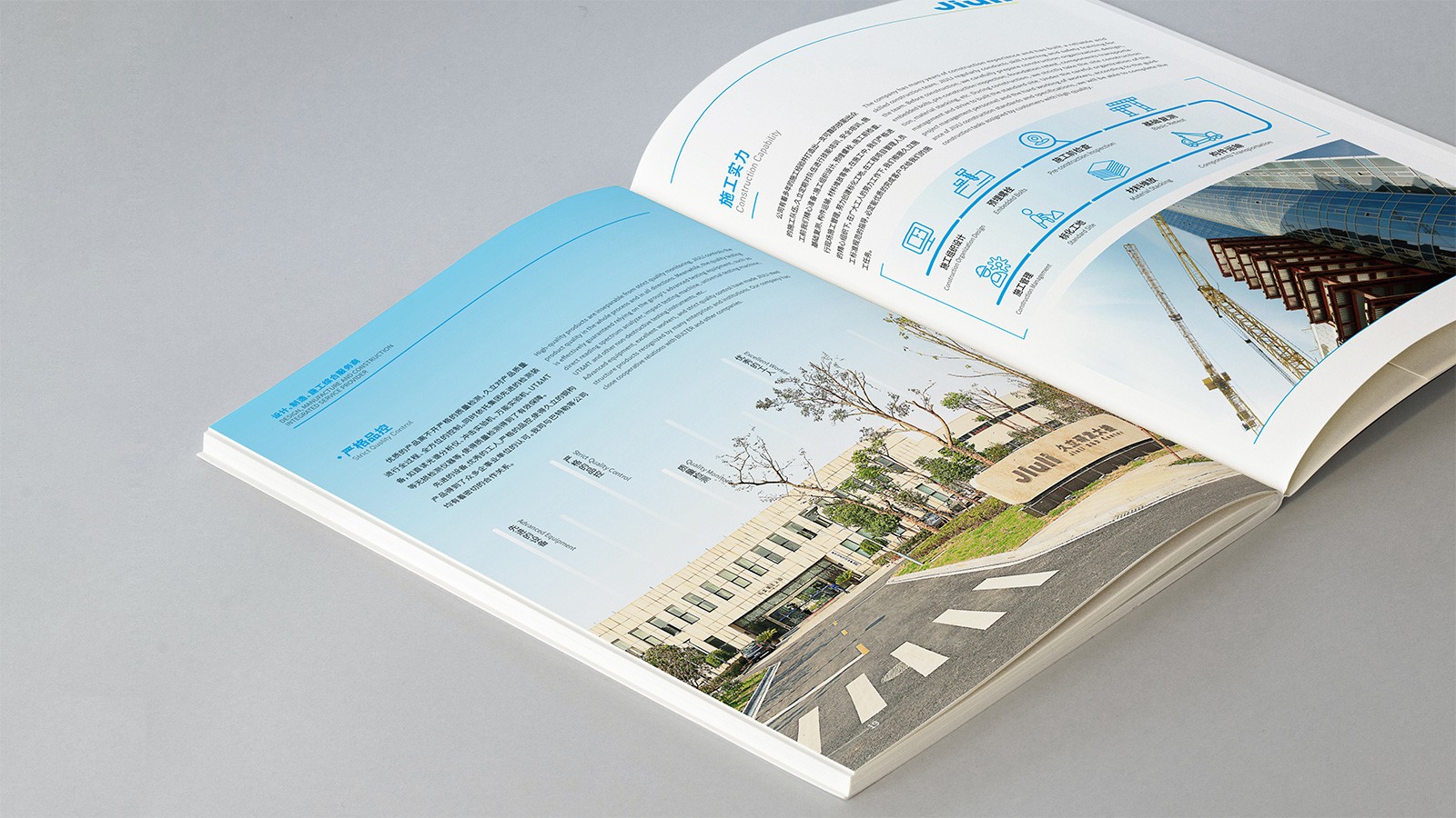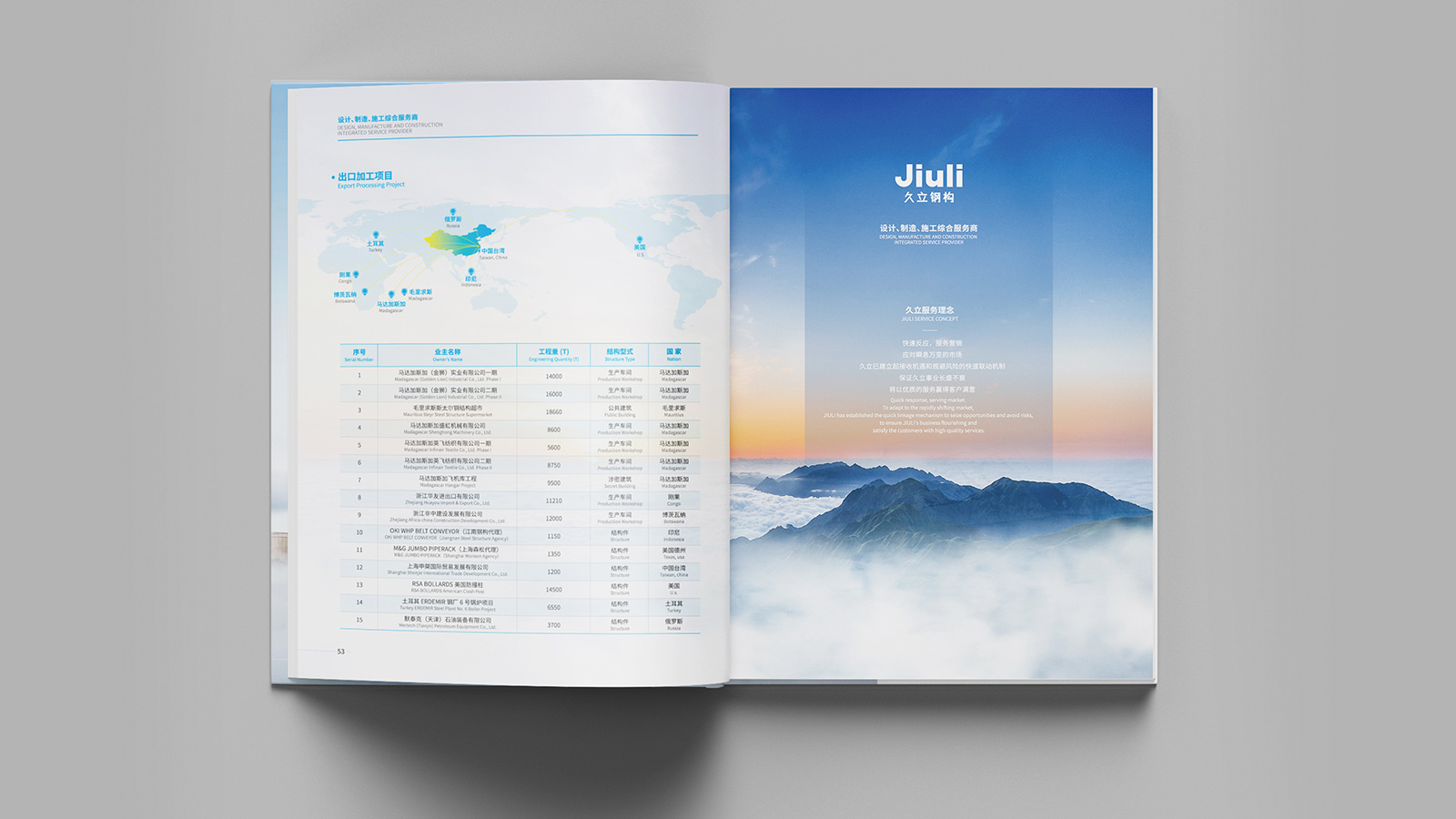 浙江久立鋼構工程有限公司創(chuàng)建于2001年2月,地處中國經(jīng)濟最具活力之稱的“長三角”太湖南岸——浙江省湖州市,是久立集團的全資子公司,公司建有完善的質保體系,通過了ISO9001:2015質保體系的認證。擁有建設部頒發(fā)的鋼結構專業(yè)承包壹級資質。承接各類工業(yè)與民用鋼結構的設計、制造和安裝。公司立足國內(nèi)市場,目前已在全國建立多個營銷辦事處,逐步形成了輻射全國的營銷網(wǎng)絡,并積極參與國際競爭。“以成熟的技術和可靠的產(chǎn)品質量服務用戶,貢獻社會,發(fā)展自己”是久立的文化,可見公司對宣傳冊設計有著較高的要求,因此委托石特設計一本體現(xiàn)公司理念的宣傳冊。