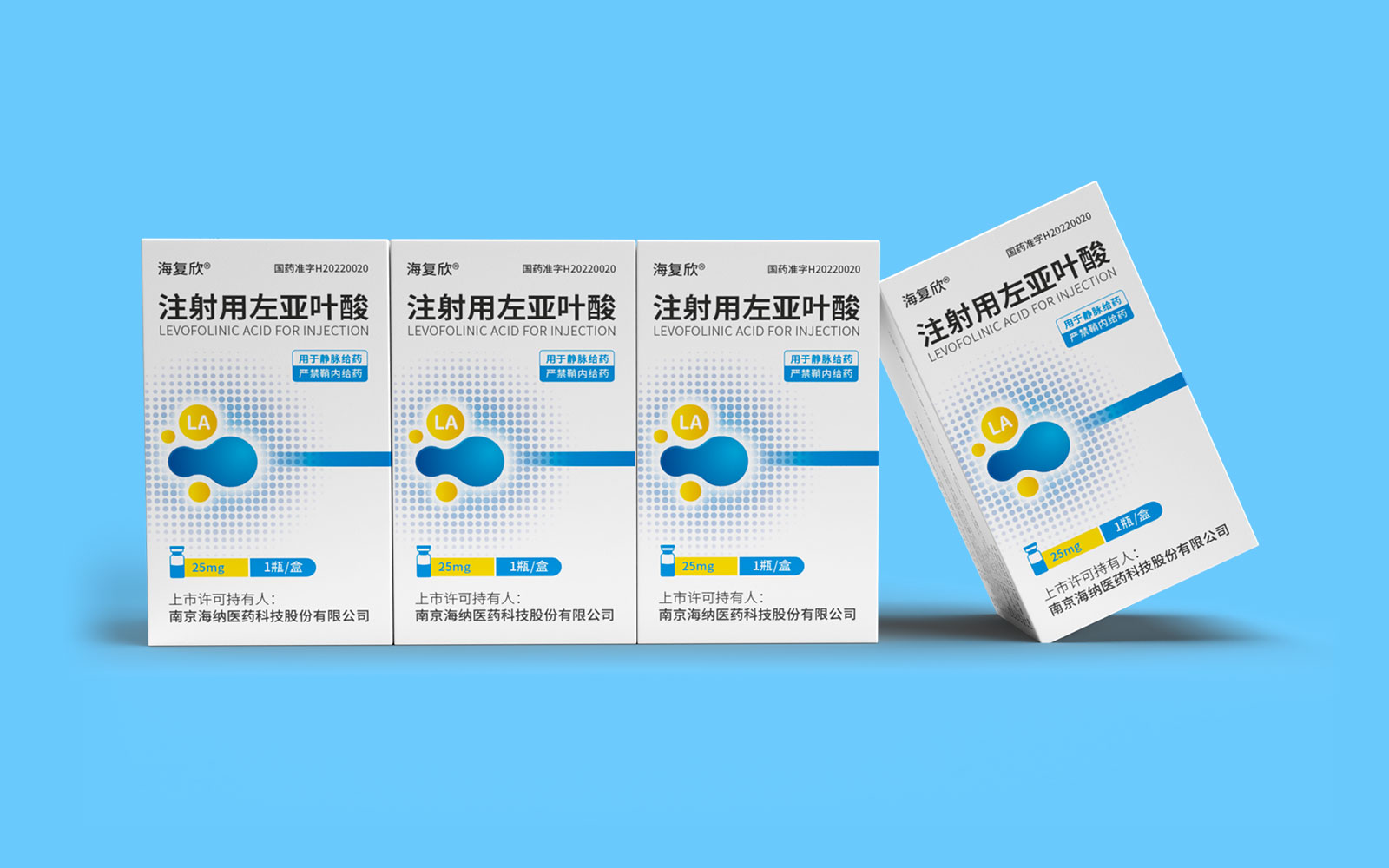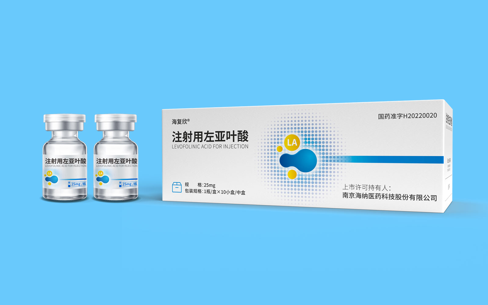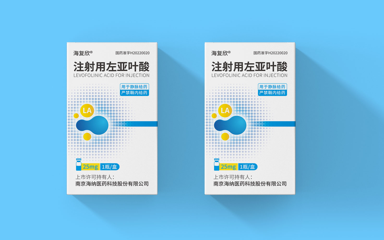 色彩運(yùn)用上,藍(lán)色具有極強(qiáng)的醫(yī)藥行業(yè)專屬性,同時(shí)藍(lán)色安靜舒適,益于舒緩情緒,保持平靜。黃色為藥品粉末顏色,與本藥品特性相呼應(yīng),整體顏色簡約醒目。LA左亞葉酸首字母縮寫;同時(shí)體現(xiàn)藥品具有預(yù)防腫瘤、抑制腫瘤增殖和再生的作用的應(yīng)用途徑,加強(qiáng)對(duì)藥品的認(rèn)知與記憶。擴(kuò)散波點(diǎn)以漸變擴(kuò)散波點(diǎn)的形式凸顯產(chǎn)品快速起效的特點(diǎn)。