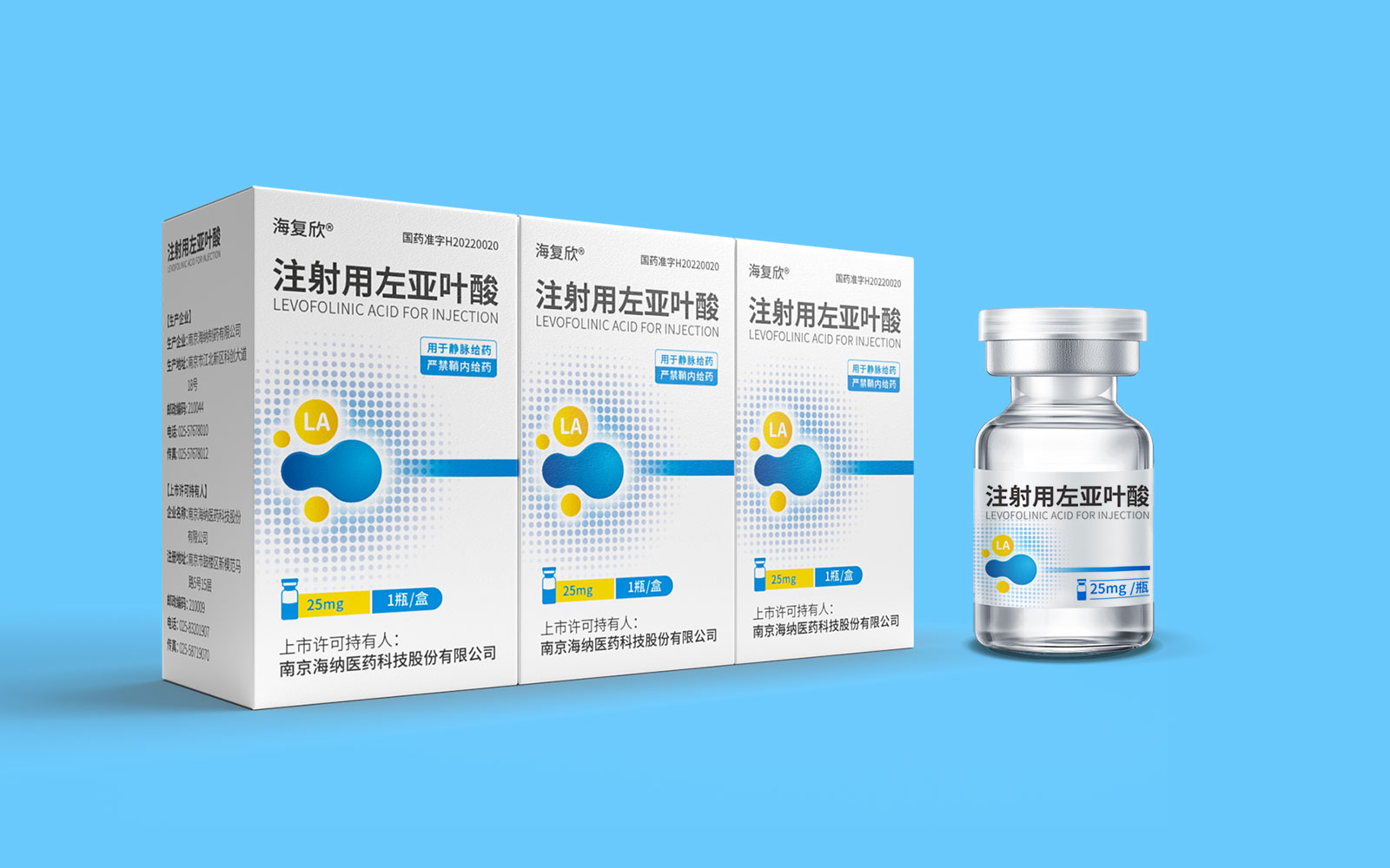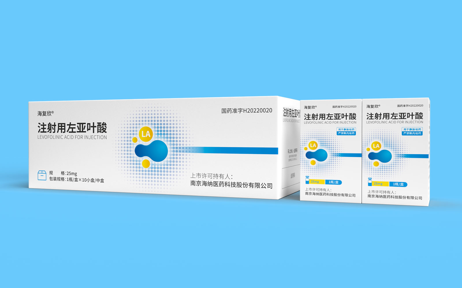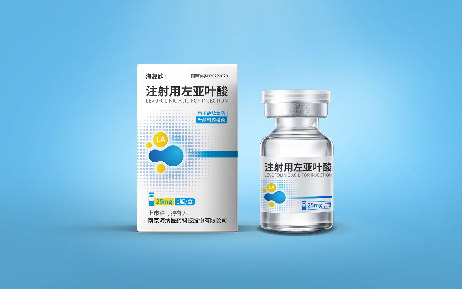 色彩運(yùn)用上,藍(lán)色具有極強(qiáng)的醫(yī)藥行業(yè)專屬性,同時(shí)藍(lán)色安靜舒適,益于舒緩情緒,保持平靜。黃色為藥品粉末顏色,與本藥品特性相呼應(yīng),整體顏色簡約醒目。LA左亞葉酸首字母縮寫;同時(shí)體現(xiàn)藥品具有預(yù)防腫瘤、抑制腫瘤增殖和再生的作用的應(yīng)用途徑,加強(qiáng)對(duì)藥品的認(rèn)知與記憶。擴(kuò)散波點(diǎn)以漸變擴(kuò)散波點(diǎn)的形式凸顯產(chǎn)品快速起效的特點(diǎn)。