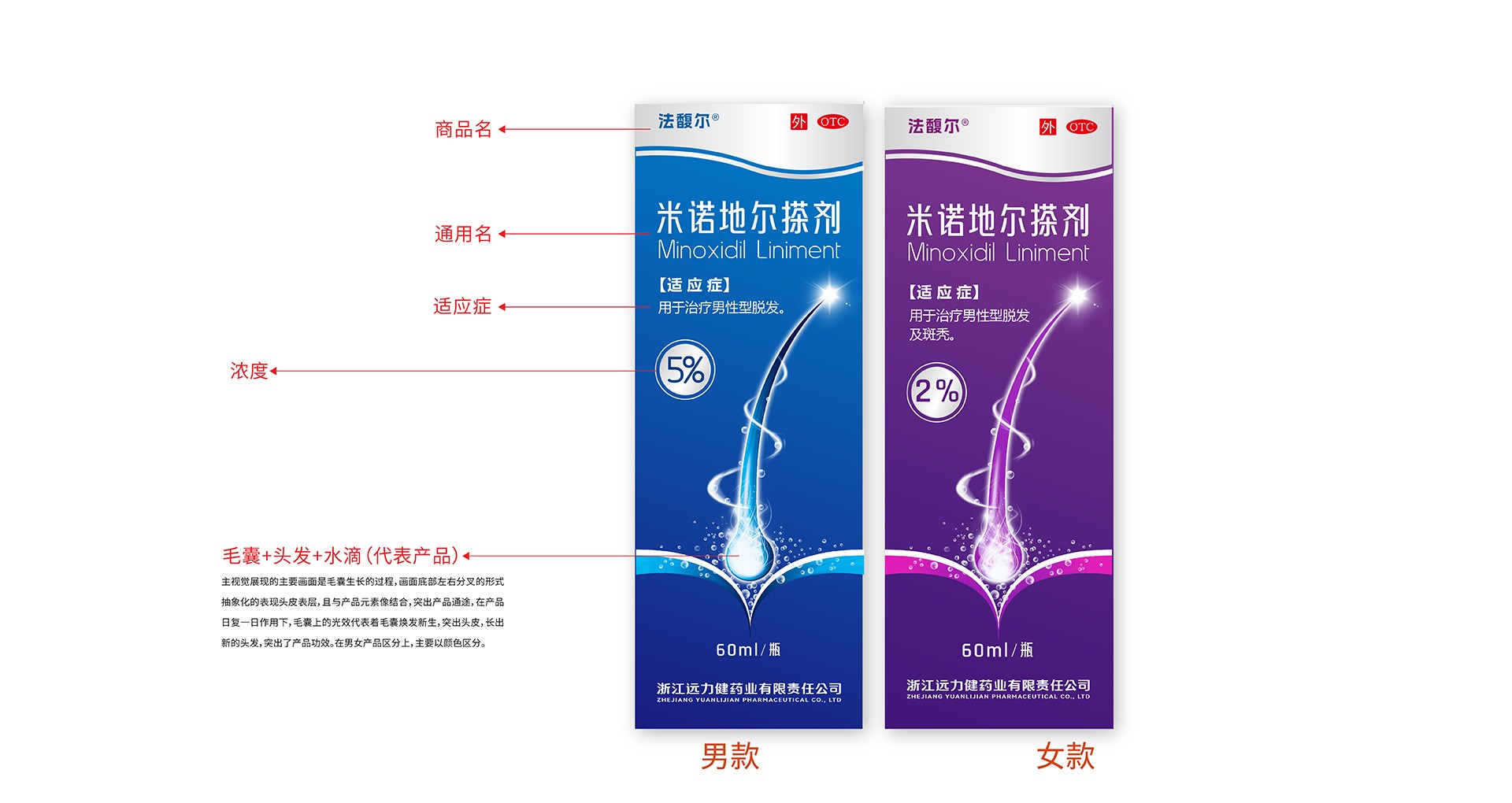主視覺展現的主要畫面是毛囊生長的過程,畫面底部左右分叉的形式抽象化的表現頭皮表層,且與產品元秦像結合,突出產品通途,在產品日復一日作用下,毛囊上的光效代表著毛囊煥發新生,突出頭皮,長出新的頭發,突出了產品功效。在男女產品區分上,主要以顏色區分。