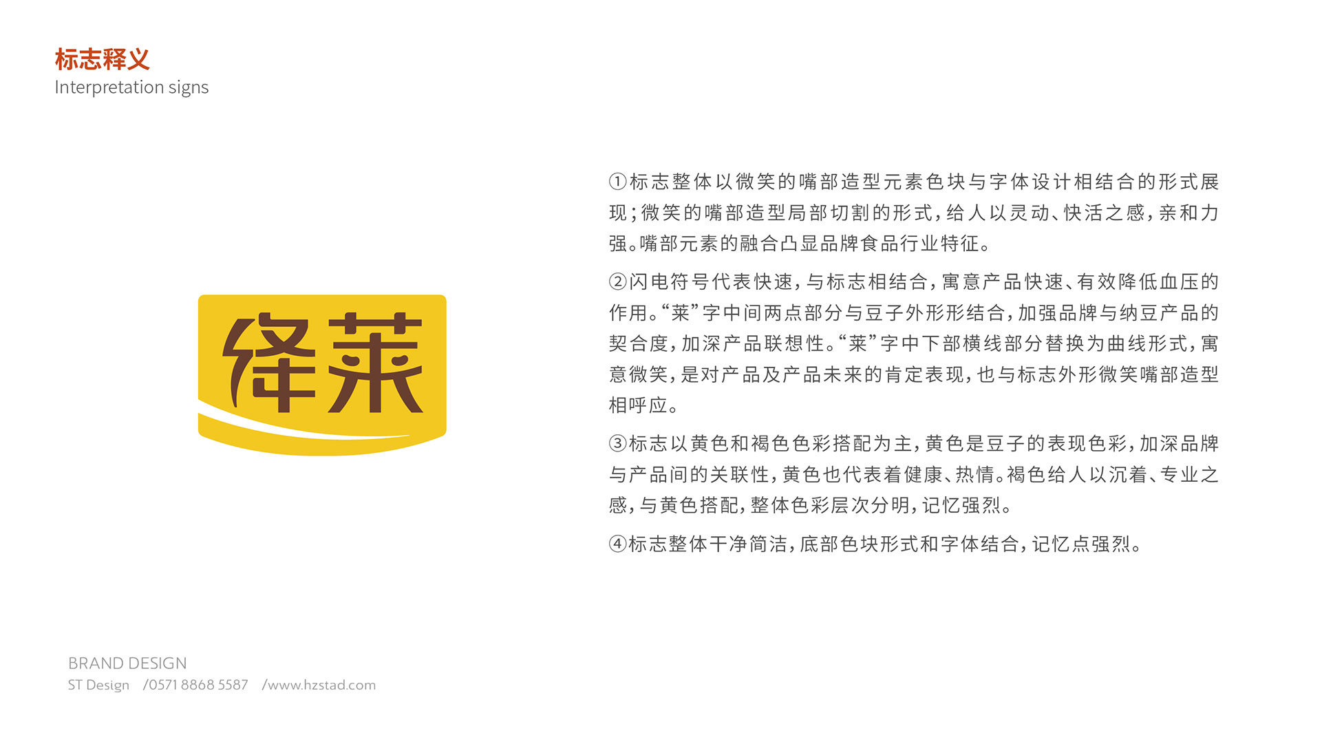 標志整體以微笑的嘴部造型元素色塊與字體設(shè)計相結(jié)合的形式展現(xiàn);微笑的嘴部造型局部切割的形式,給人以靈動,快活之感,親和力強。閃電符號代表快速,與標志相結(jié)合,寓意產(chǎn)品快速,有效降低血壓的作用?!叭R”字中間兩點部分與豆子外形相結(jié)合,加強品牌與納豆產(chǎn)品的契合度,加深產(chǎn)品的聯(lián)想性。