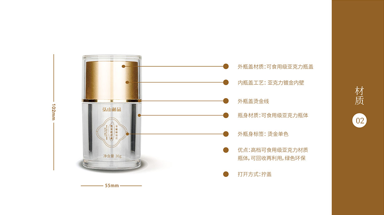 首先內(nèi)盒采用透明食用級(jí)亞克力瓶身,對(duì)品牌獨(dú)有標(biāo)牌和弘山利品品牌標(biāo)簽進(jìn)行設(shè)計(jì),黑米+花的形狀,結(jié)合黑米的黑,體現(xiàn)“米中黑珍珠”的營(yíng)養(yǎng)價(jià)值;再用金色,其一含義是黑米稻穗的顏色,體現(xiàn)天然無(wú)添加的自然感受;其二含義是黑米花青素是色素之精品,體現(xiàn)其高貴地位。通過(guò)包裝升級(jí)統(tǒng)一形象后,深化了弘山禮品在用戶心中的外在形象,品類(lèi)包裝問(wèn)題得以解決。
