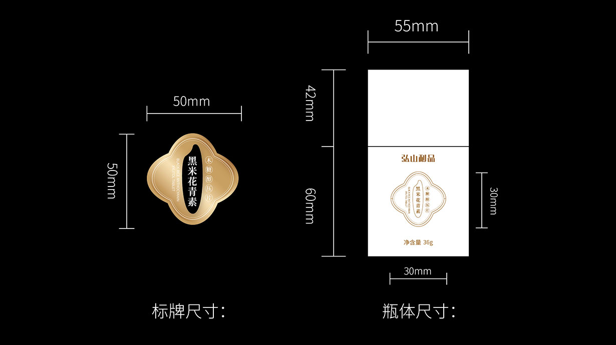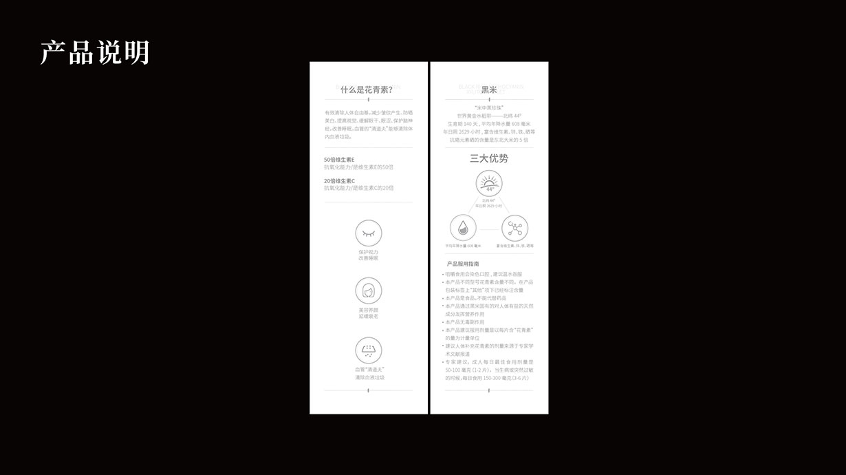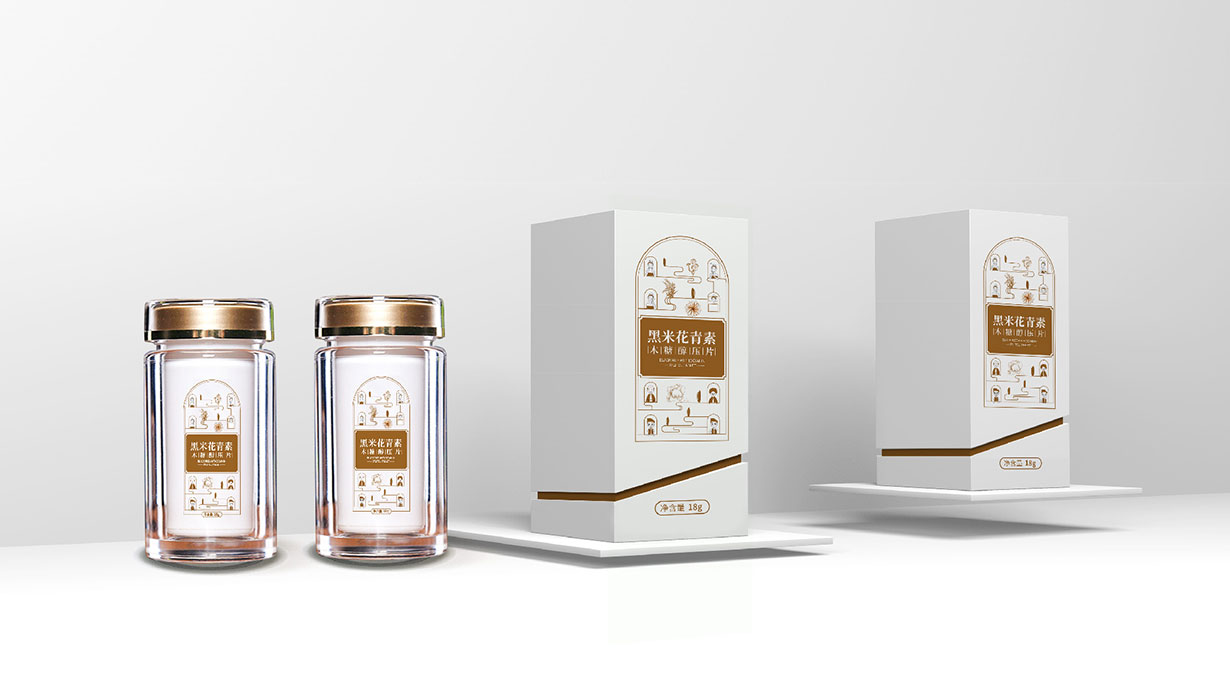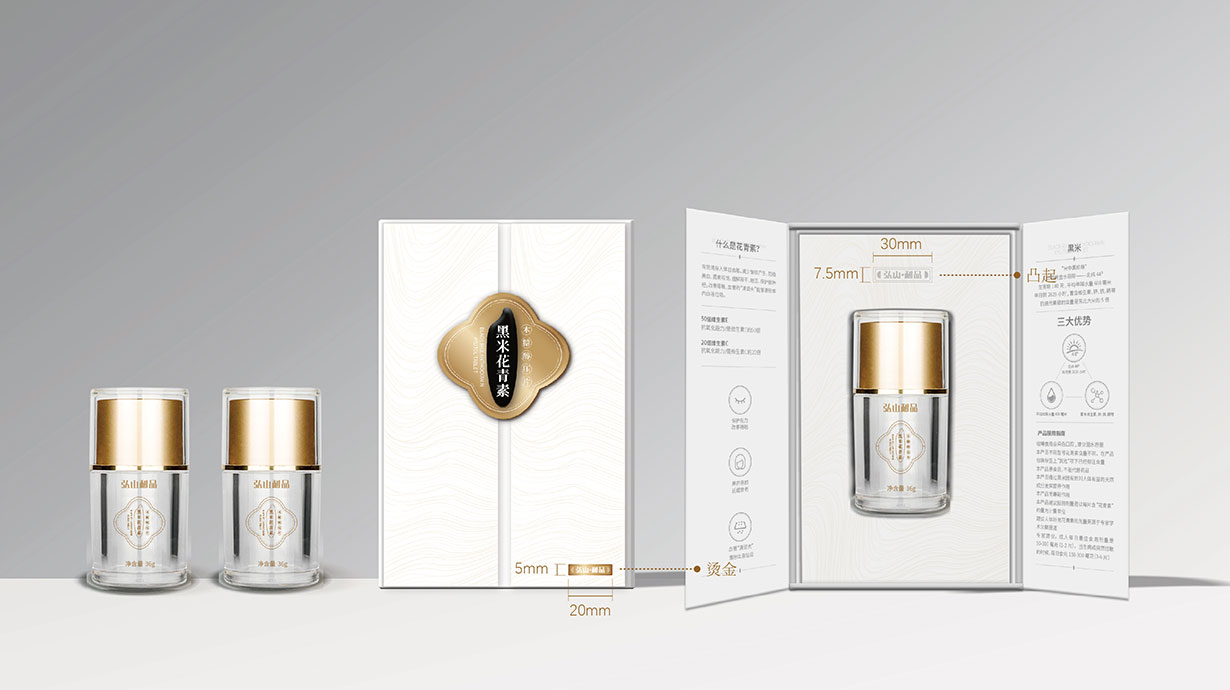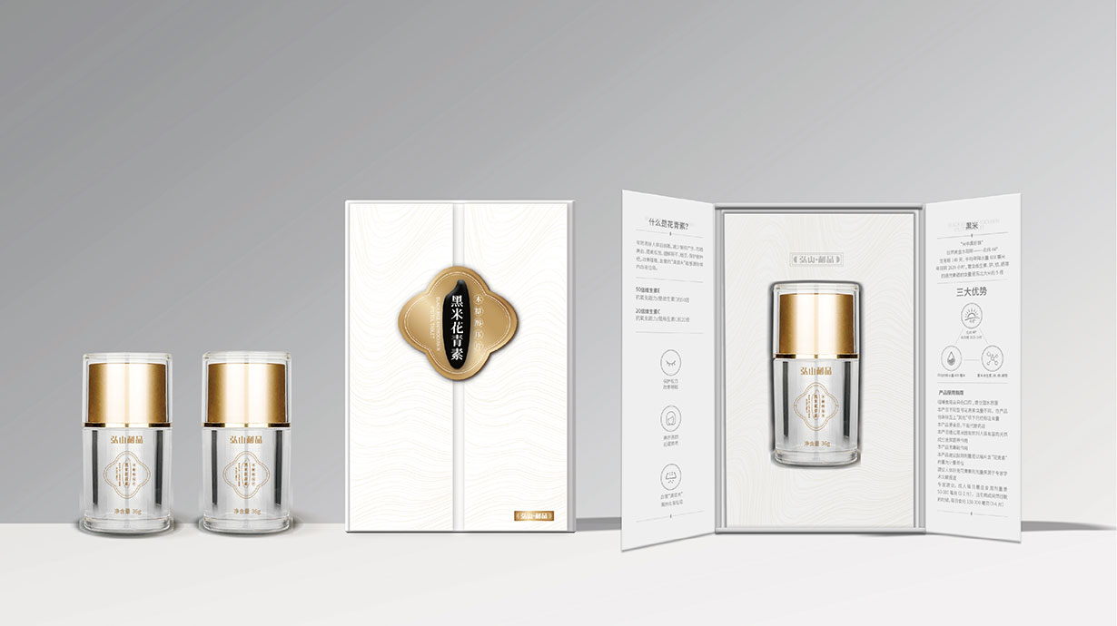 針對(duì)這一目標(biāo)問(wèn)題,石特從黑米花青素本身代表的含義出發(fā),在包裝上著重體現(xiàn)其特色,為其梳理了內(nèi)盒外盒的包裝設(shè)計(jì),提升了其品牌形象。