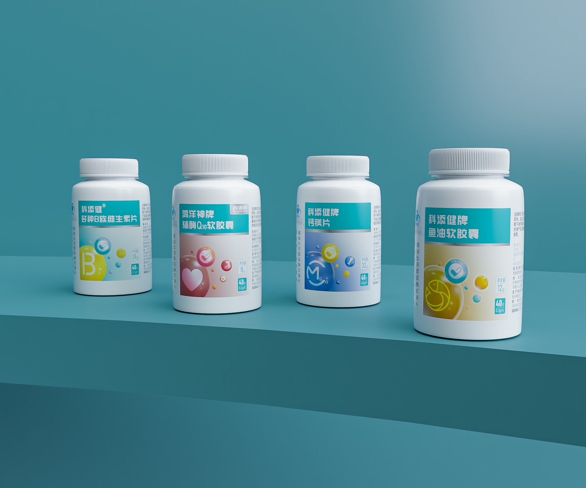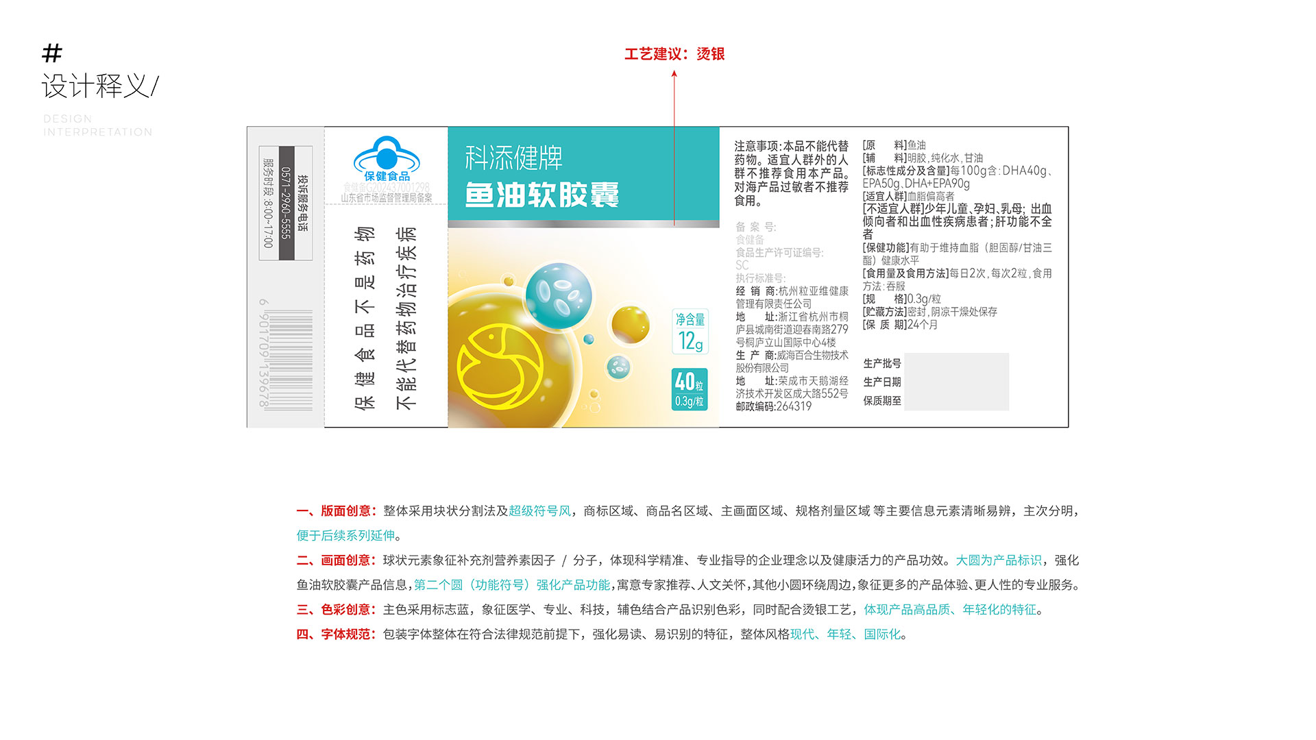 二、畫面創意:球狀元素象征補充劑營養素因子/分子,體現科學精準、專業指導的企業理念以及健康活力的產品功效。大圓為產品標識,強化魚油軟膠囊產品信息,第二個圓(功能符號)強化產品功能,寓意專家推薦、人文關懷,其他小圓環繞周邊,象征更多的產品體驗、更人性的專業服務。