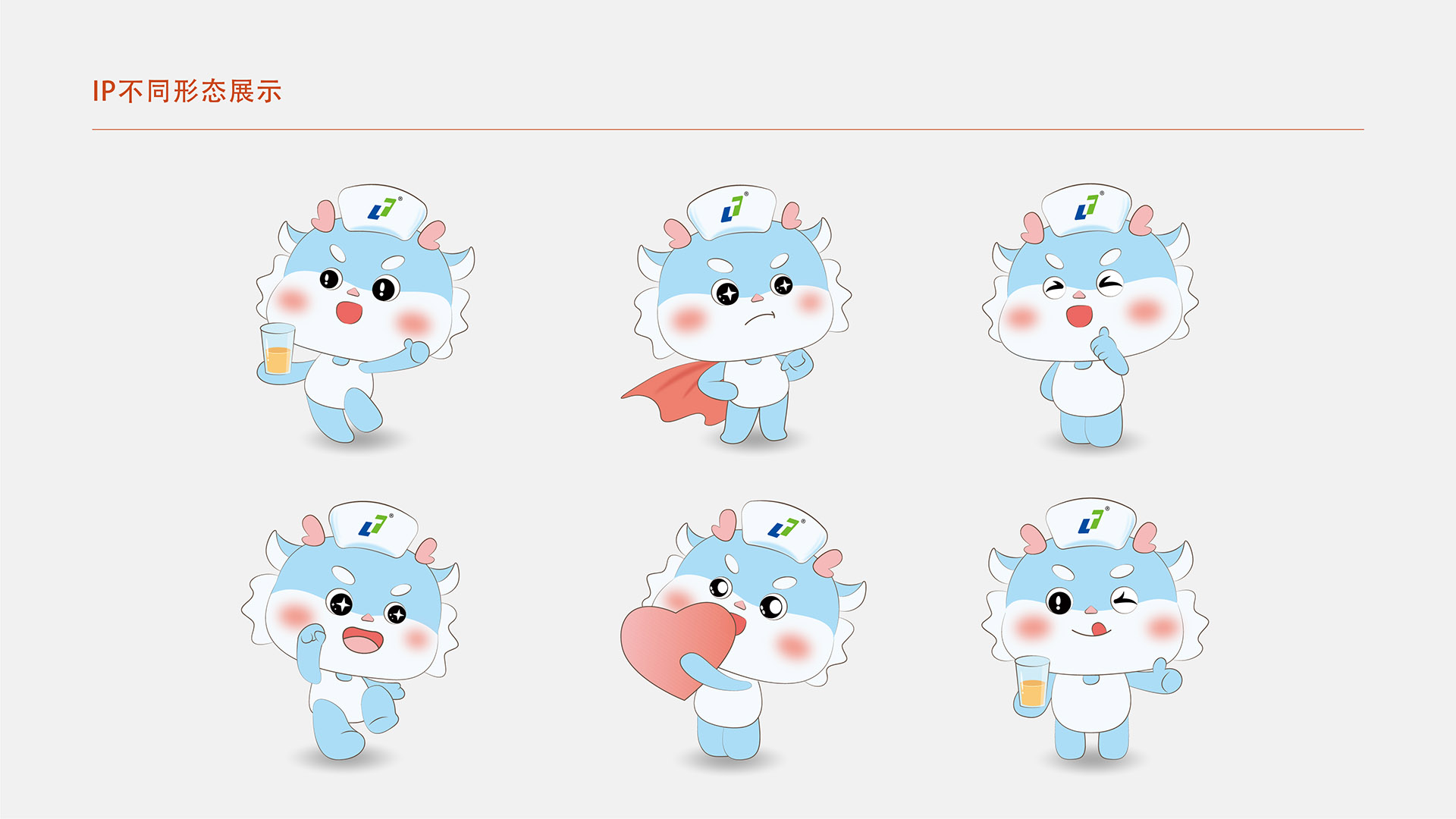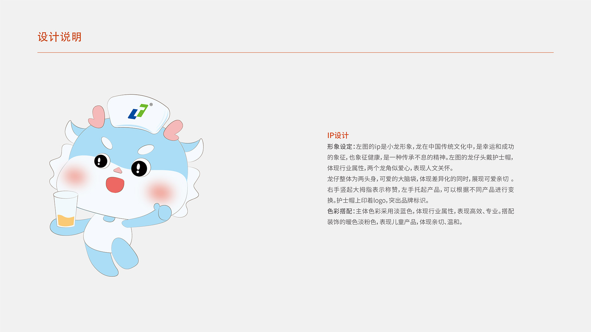IP形象設定:左圖的ip是小龍形象,龍在中國傳統文化中,是幸運和成功的象征,也象征健康,是一種傳承不息的精神。左圖的龍仔頭戴護士帽,體現行業屬性,兩個龍角似愛心,表現人文關懷。龍仔整體為兩頭身,可愛的大腦袋,體現差異化的同時,展現可愛親切。右手豎起大拇指表示稱贊,左手托起產品,可以根據不同產品進行變換。護士帽上印著log0,突出品牌標識。色彩搭配:主體色彩采用淡藍色,體現行業屬性,表現高效、專業。搭配裝飾的暖色淡粉色,表現兒童產品,體現親切、溫和。