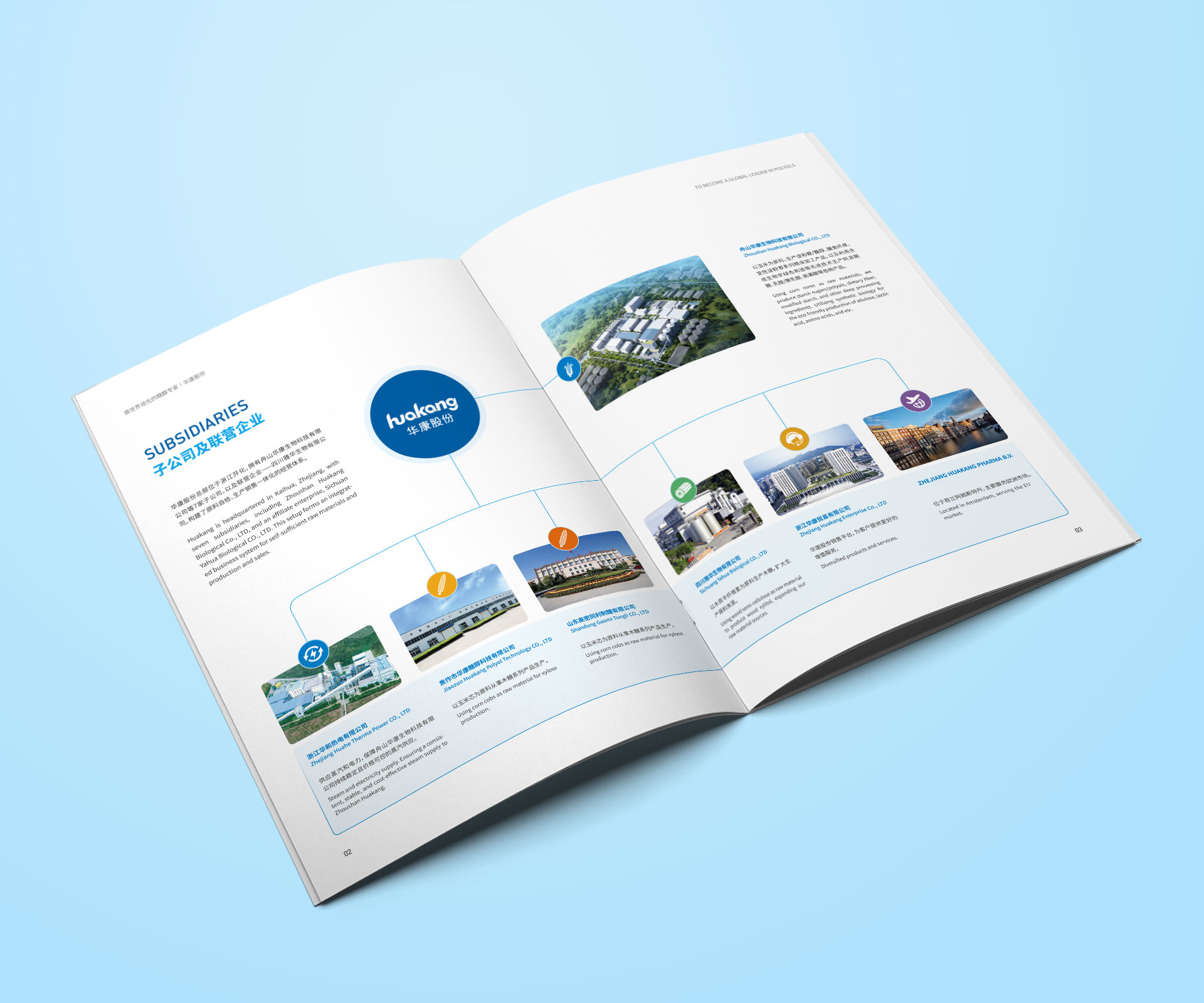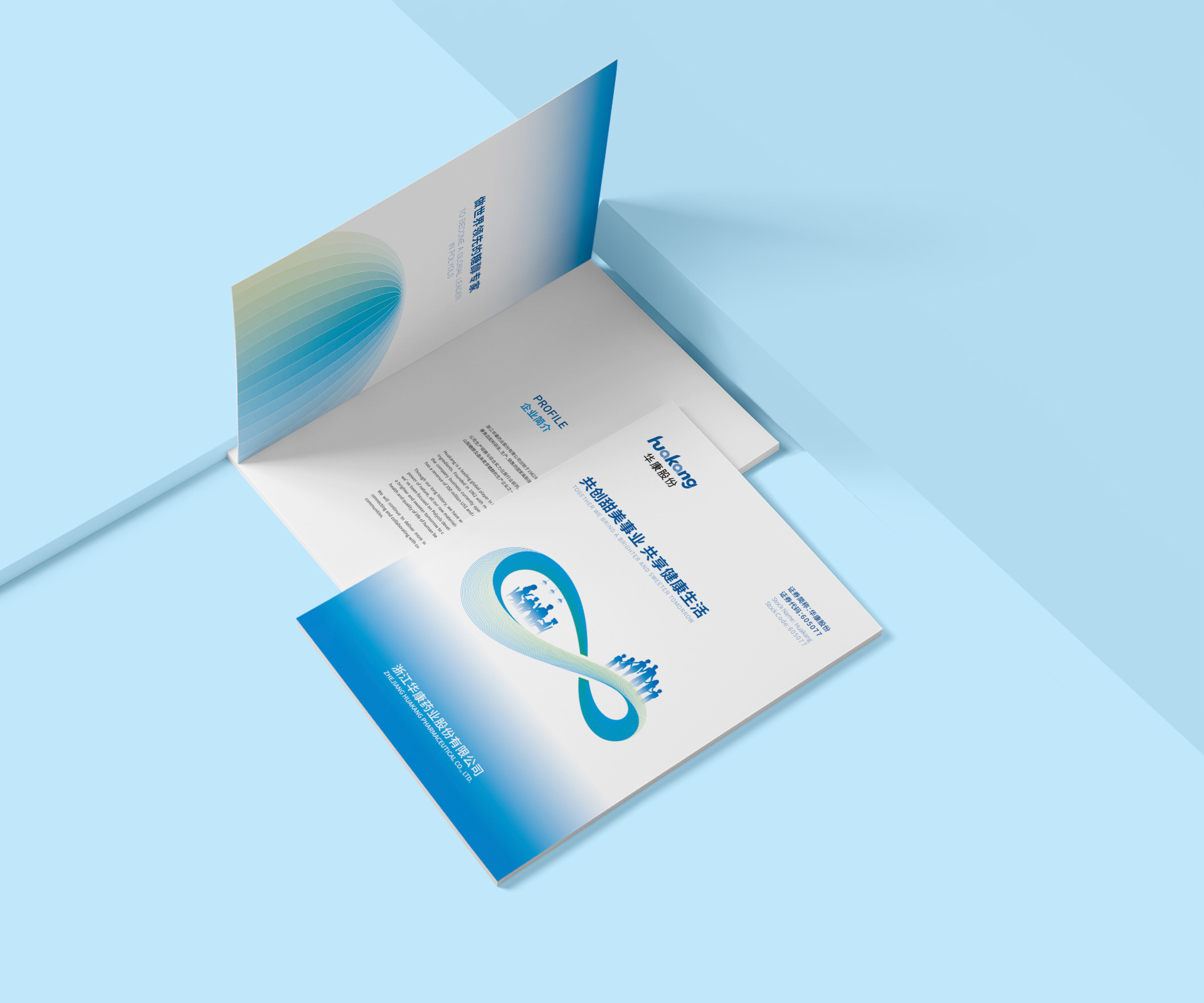 提取浙江華康藥業品牌關聯色 —— 藍色系為主色調,傳遞 “專業、科技、健康” 的品牌屬性;搭配淺藍、白色漸變,營造清新、活力的視覺氛圍,呼應 “甜美事業、健康生活” 的品牌使命,讓受眾直觀感知企業專注健康配料的價值主張。