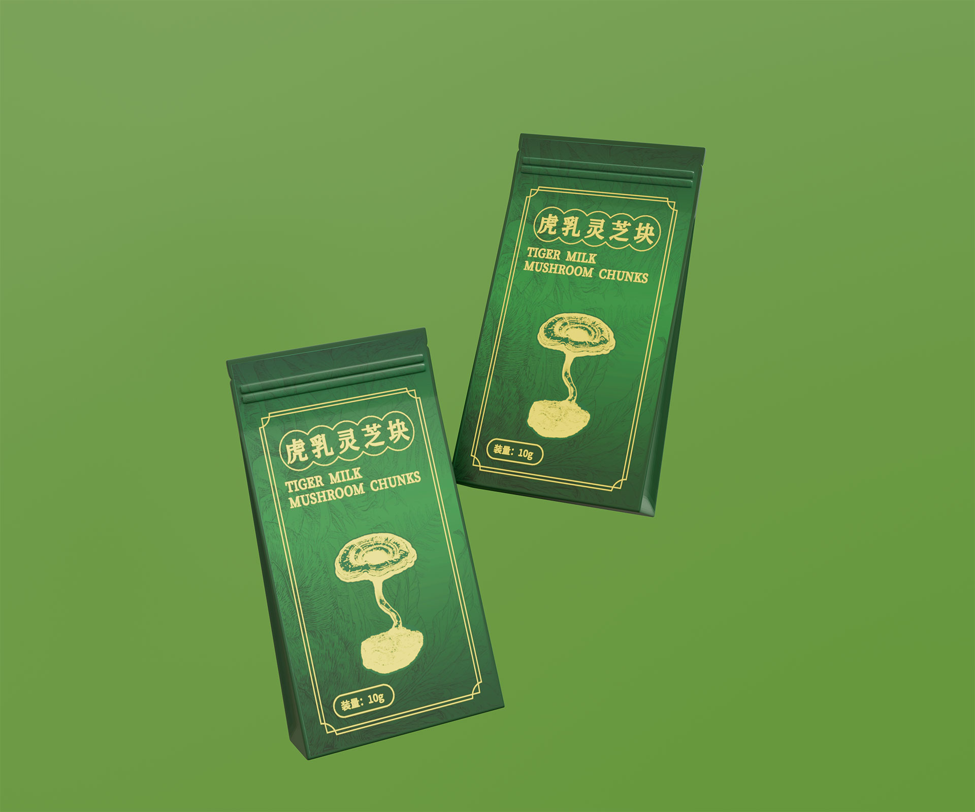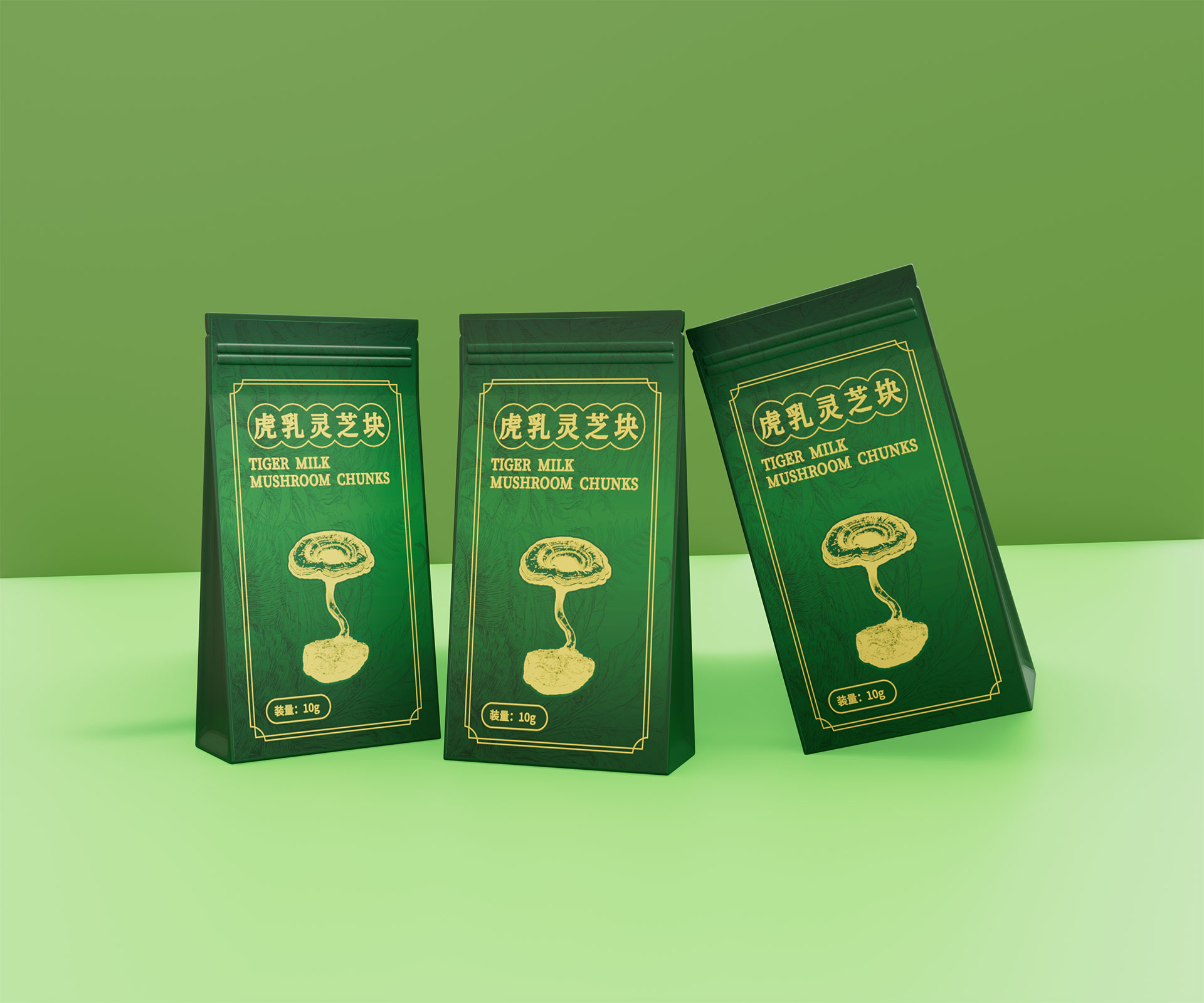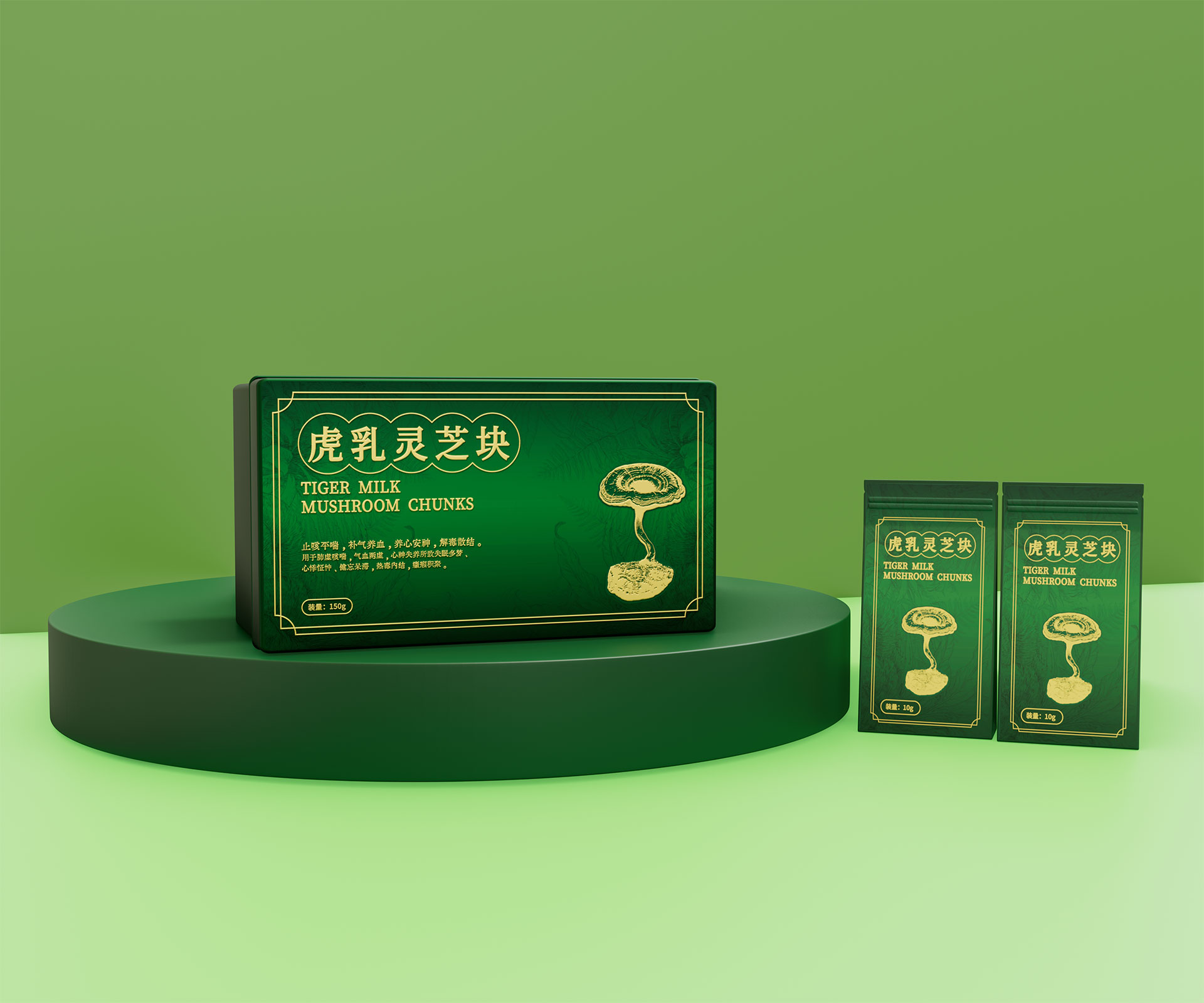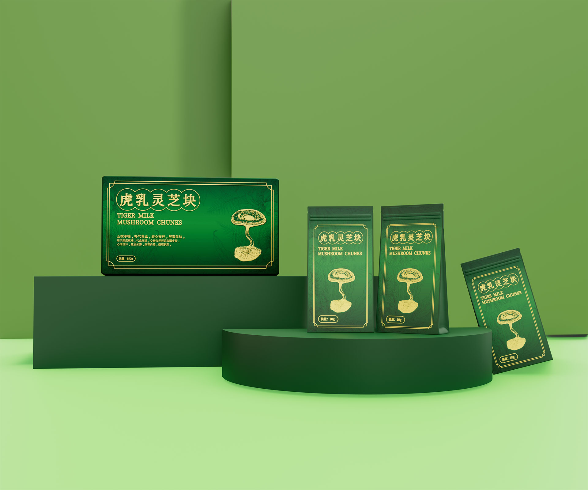 標(biāo)志與字體系統(tǒng):設(shè)計(jì)中英文組合標(biāo)志。“虎乳靈芝”中文采用典雅的手寫書法字體,體現(xiàn)文化傳承;“TIGERMILK MUSHROOM CHUNKS”英文部分采用現(xiàn)代、簡(jiǎn)約的無(wú)襯線字體,確保國(guó)際識(shí)別性。二者結(jié)合,奠定“東方底蘊(yùn),國(guó)際表達(dá)”的基調(diào)。